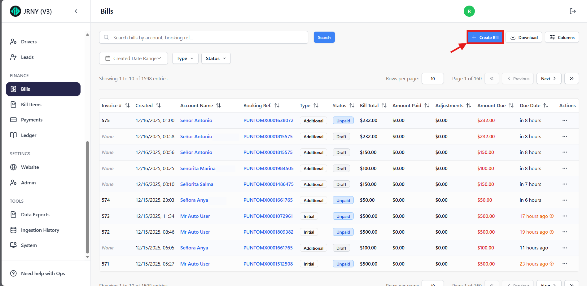 - Fill in the details of the customer/booking to be charged in the Create Bill page:
