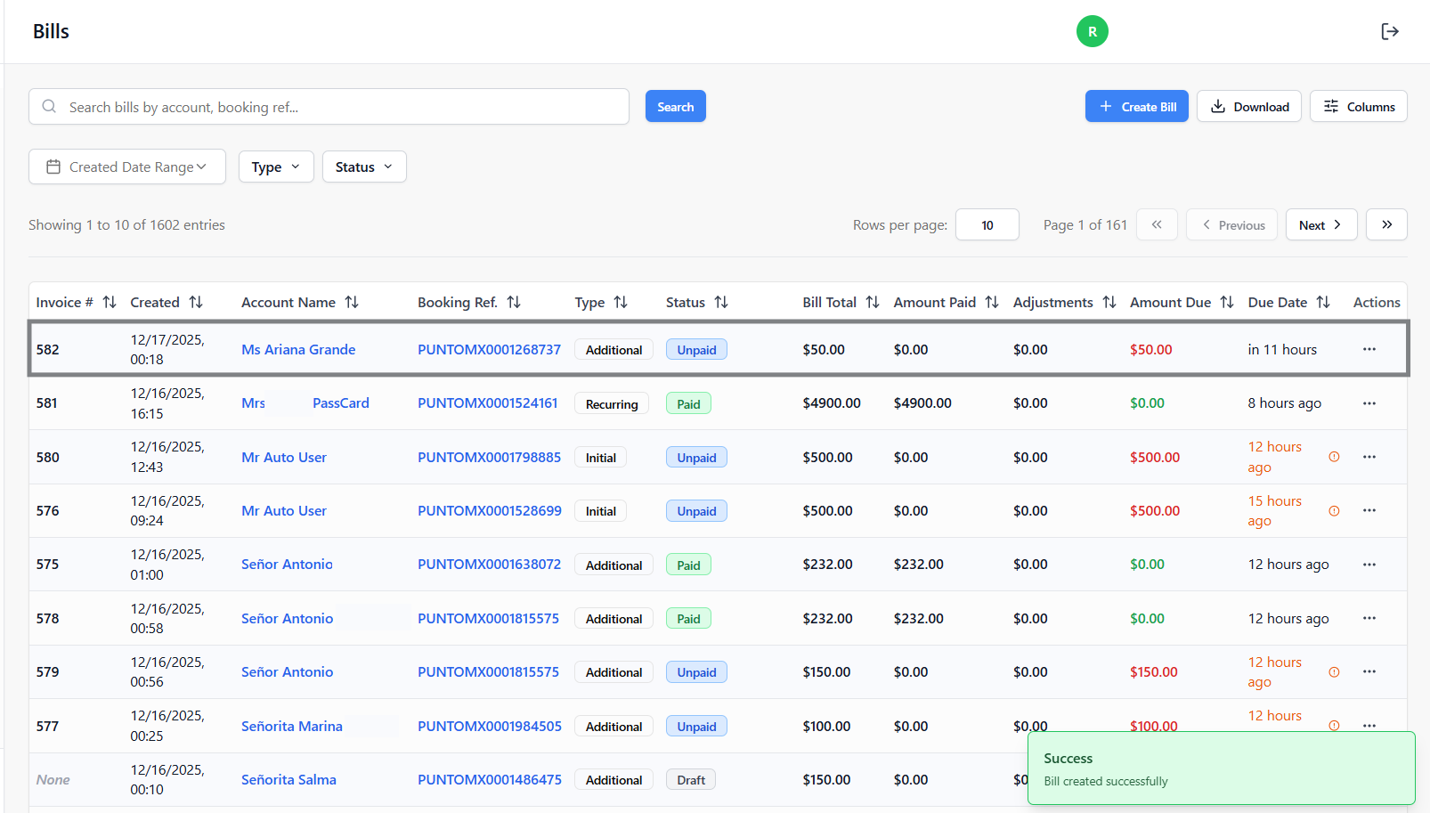 - After creating the bill, a green toast notification appears at the right corner of the screen and the newly created bill can be seen: