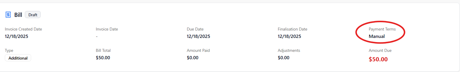 - Manual — indicates a No Payment Bill, where payment must be recorded manually using the Offline Payment method.